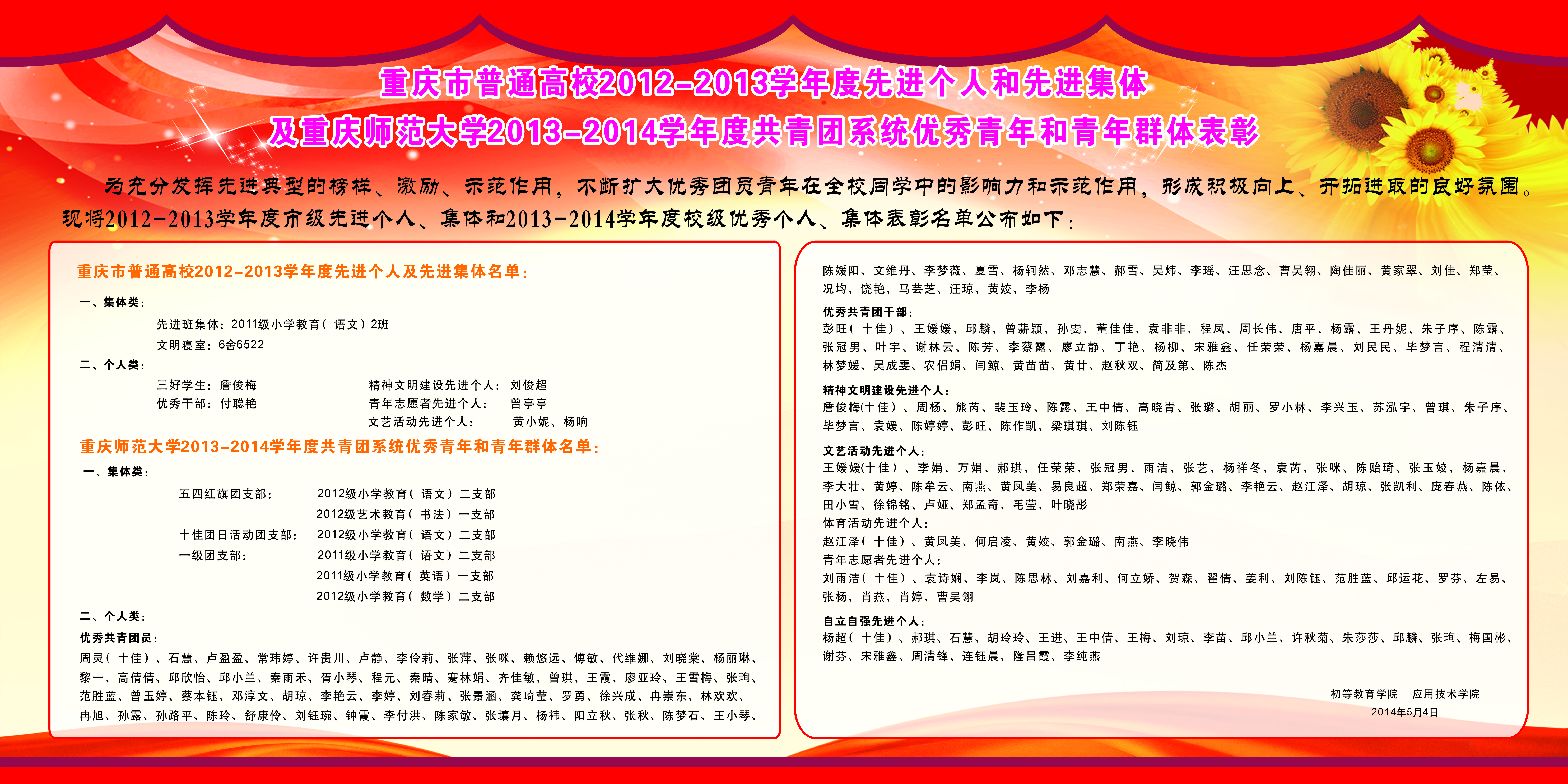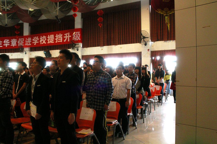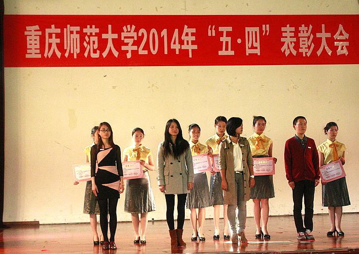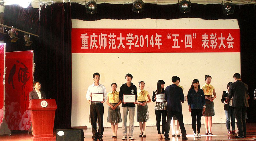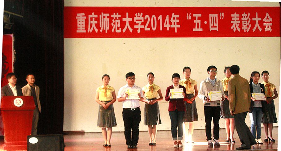 4月29日下午,为大力弘扬五四精神,表彰我校先进,发挥先进典型的模范带头作用,引导全校广大团员青年积极进取,重庆师范大学2014年度“五四”表彰大会在大学城校区学生活动中心隆重举行。学校校领导、党政办、组织部、宣传部、教务处、学生处、研工部、招生就业处、团委等相关职能部门领导和各学院分管领导以及学生代表参加了此次大会,大会由校团委书记侯明志主持。我院团总支学工办及学生代表一行7人参加了此次表彰大会。