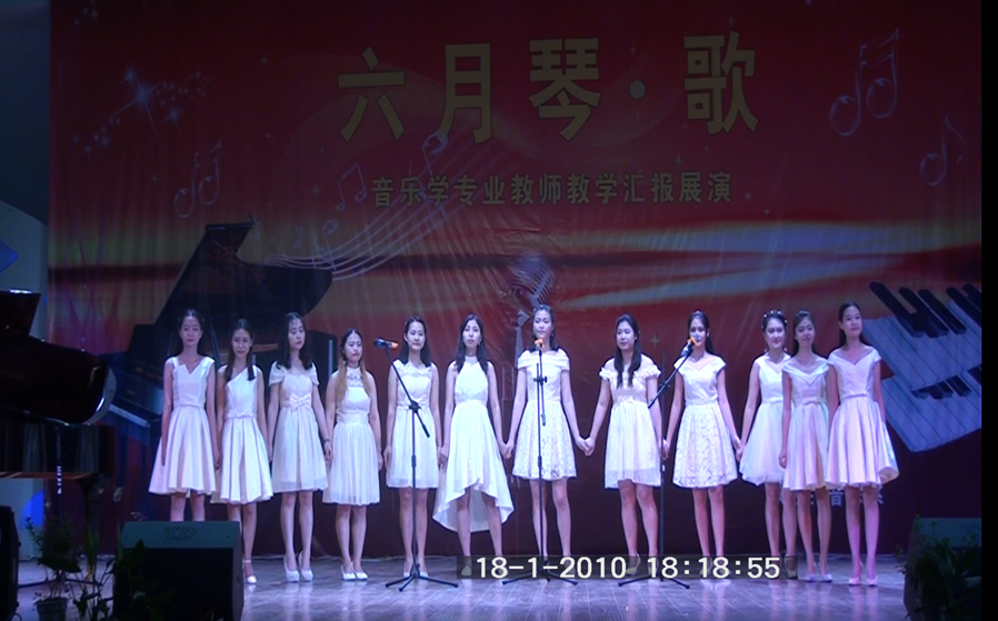 首先是女生小合唱,十二位女孩声情并茂地演唱了《You raise me up》。接着,冉佳演唱了一首新疆民歌《赛吾里麦》,歌曲表达了新疆青年在暗恋中所经历过的一切快乐时光,对爱人的一种思念。袁梦诗意演唱的《一首桃花》,表现出春之桃花,艳及芬芳,充满了林徽因对世界万物所散发的生命之光的执着追求,空灵柔和。冉佳演唱的《啊!我的虎子哥》,选自《原野》选段,是金子向虎子倾诉爱情和表达自己对自由、幸福追求的决心的唱段,缠绵、甜蜜、柔美的旋律里隐藏着勇敢和叛逆,其情感复杂,旋律起伏大,富于戏剧性。袁梦诗意演唱的《玫瑰三愿》是黄自先生创作的艺术歌曲。在作曲技法上中西融合,把当时中国艺术歌曲的创作提升了一个高度,反映了当时的知识分子在国破家亡时的忧伤心情。袁梦诗意演唱的《沁园春.雪》,其王者之气尽在其歌声之中。